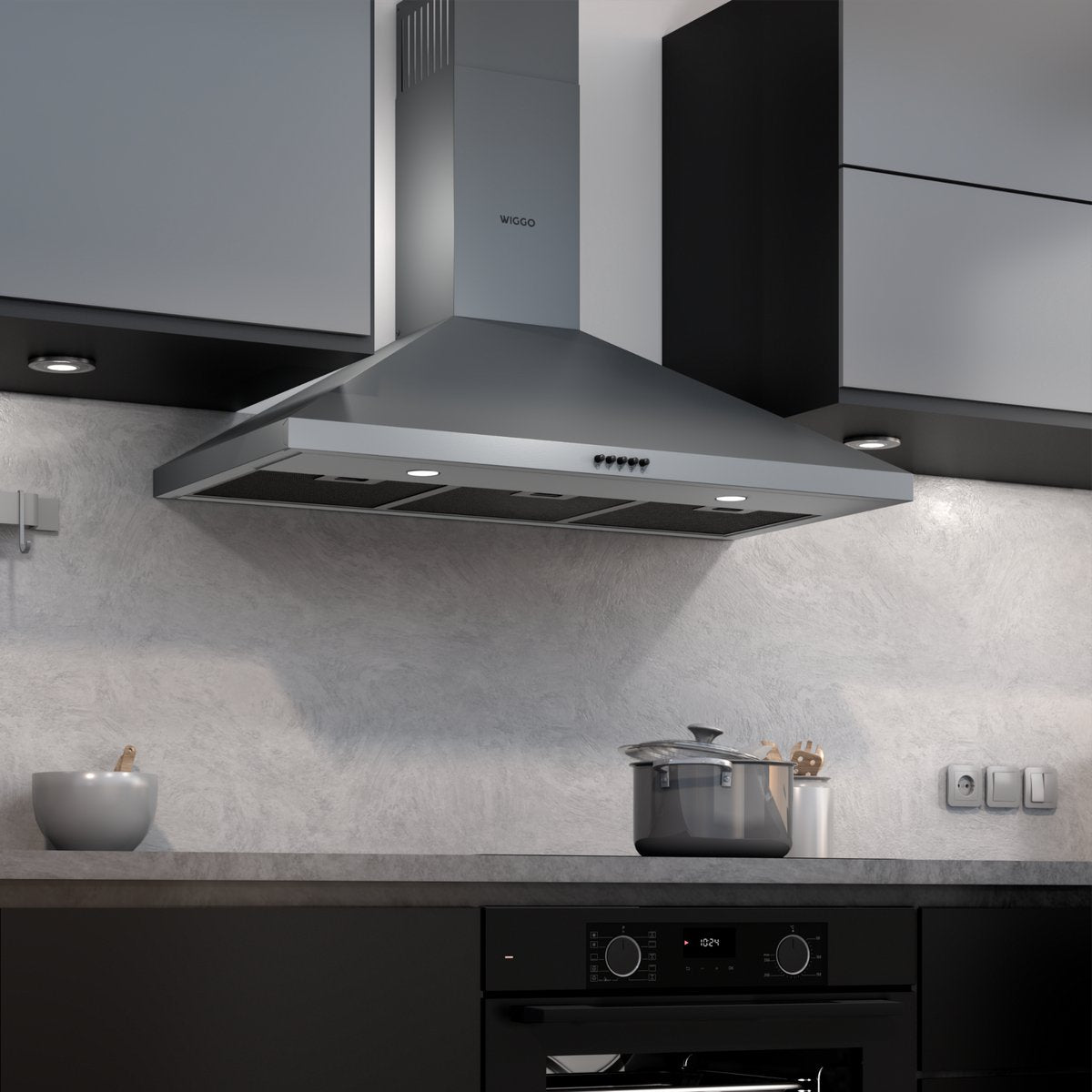 Wiggo WE‑C930P(G) – Wandschouw Afzuigkap 90 cm – Grijs – 600 m³/h – KNeeppenbediening – LED Verlichting – 5 jaar garantie