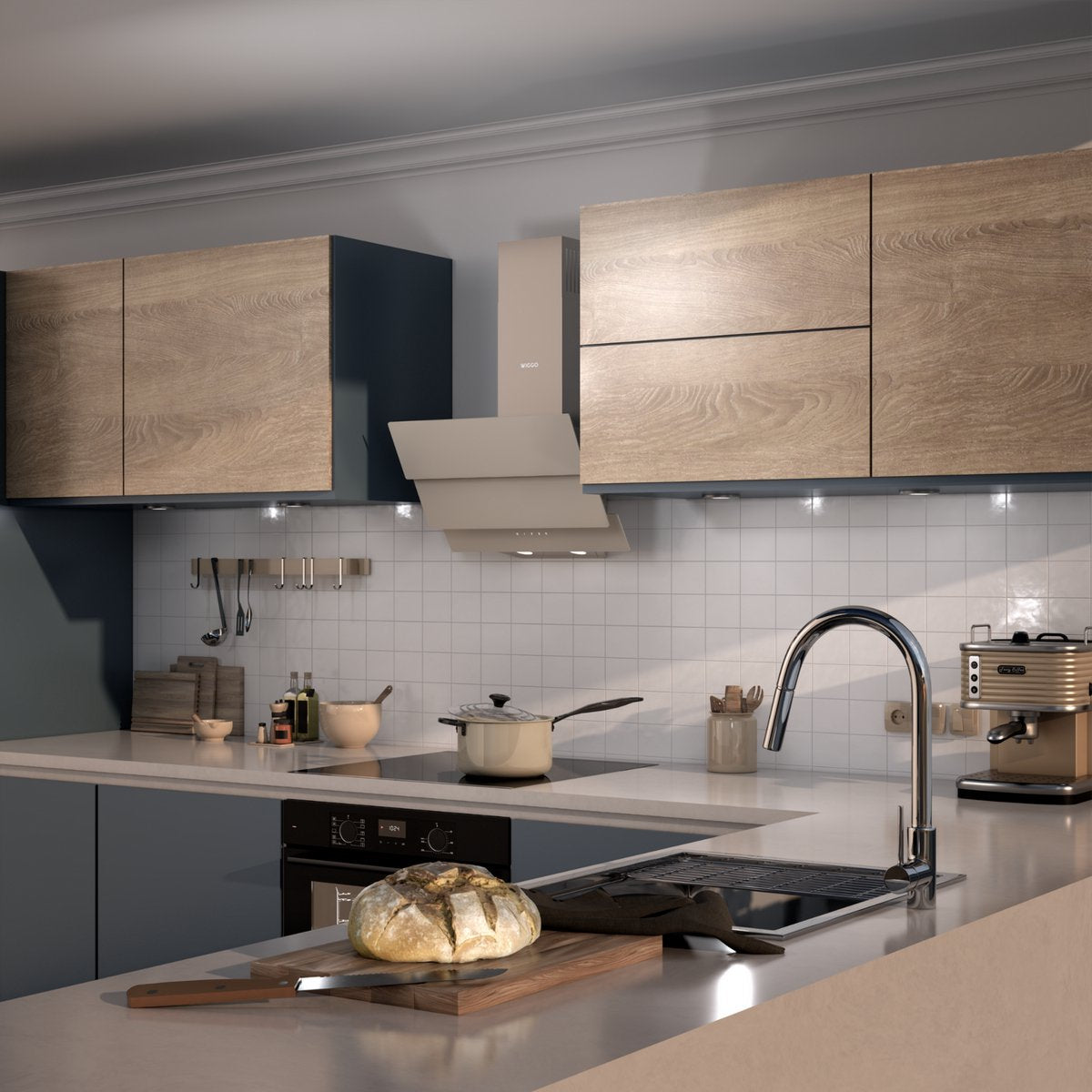 Het schuine ontwerp zorgt ervoor dat je afzuigkap niet meer in de weg zit maar wel keurig zijn werk verricht. Het ruimtelijk inrichten van je kookplateau geeft je meer ruimte om te koken met passie