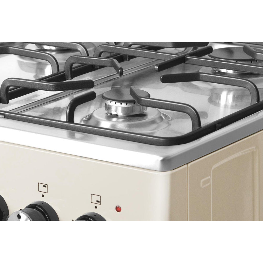 Het kookgedeelte is voorzien van vier gasbranders in verschillende vermogens, waardoor je eenvoudig kunt schakelen tussen sudderen, bakken en krachtig koken. De stevige geëmailleerde pannendragers zorgen voor stabiliteit en veiligheid tijdens het koken. Dankzij de mechanische draaiknoppen is de bediening intuïtief en betrouwbaar.