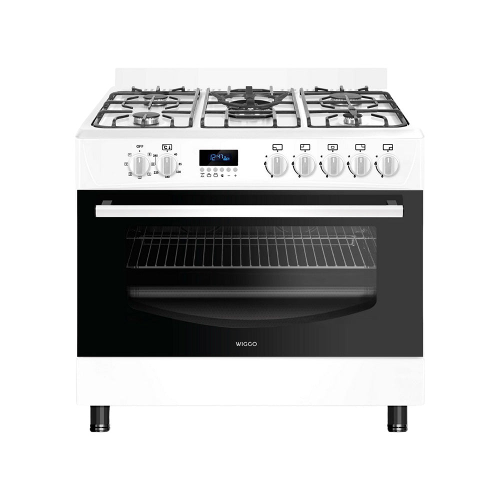 Wiggo WO‑E909R(WW) – Vrijstaand gasfornuis – 90 cm – 5 kookzones met wokbrander – 110L elektrische oven – Wit – Elektrische vonkontsteking & vlambeveiliging – Energieklasse