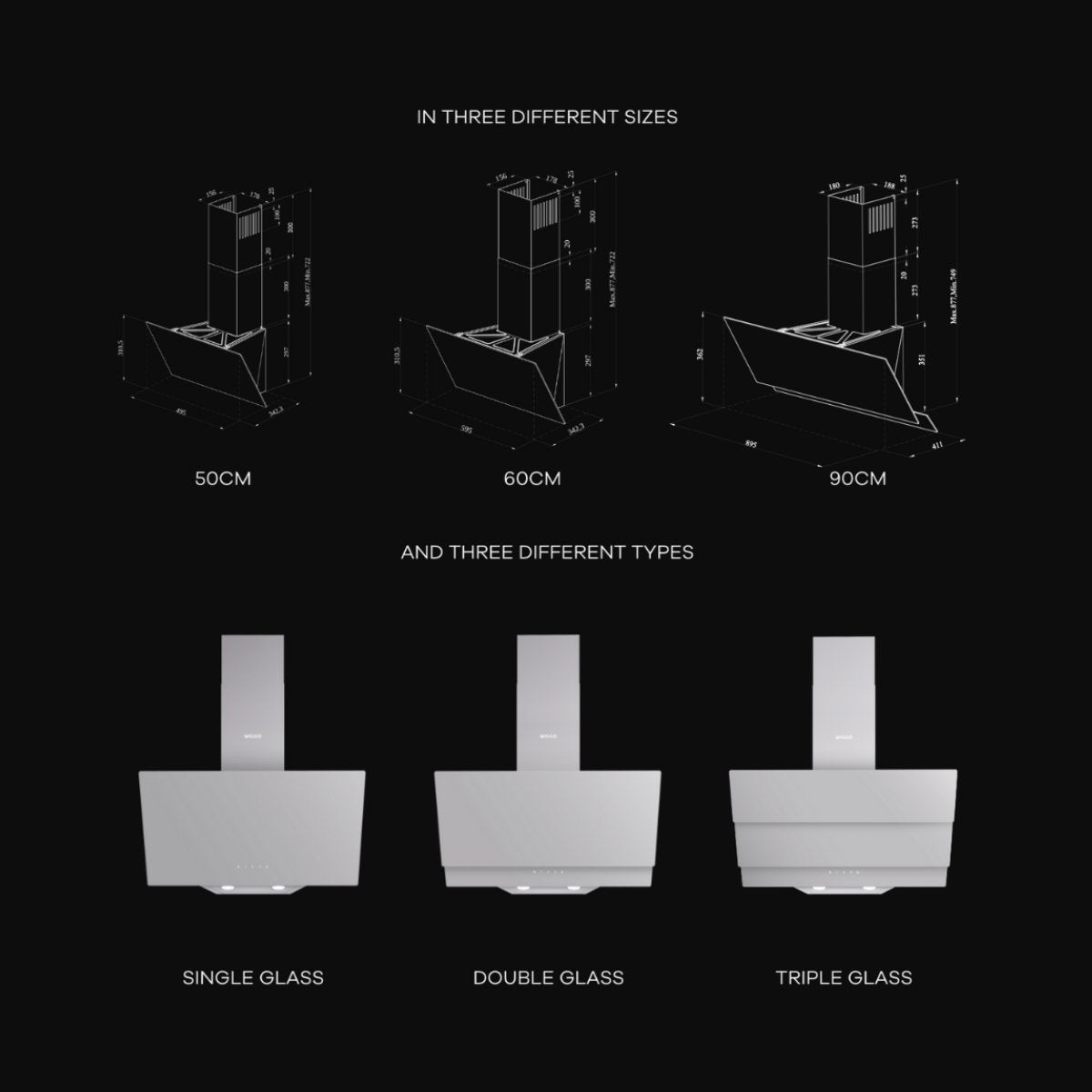 Deze Wiggo 3 serie schuine schouwkap is verkrijgbaar in meerdere kleuren en verschillende glazen designs. De gehele serie is voorzien van een krachtige Eco Double Vented Air Outlet system met uitstekende prestaties (600 m³/h).