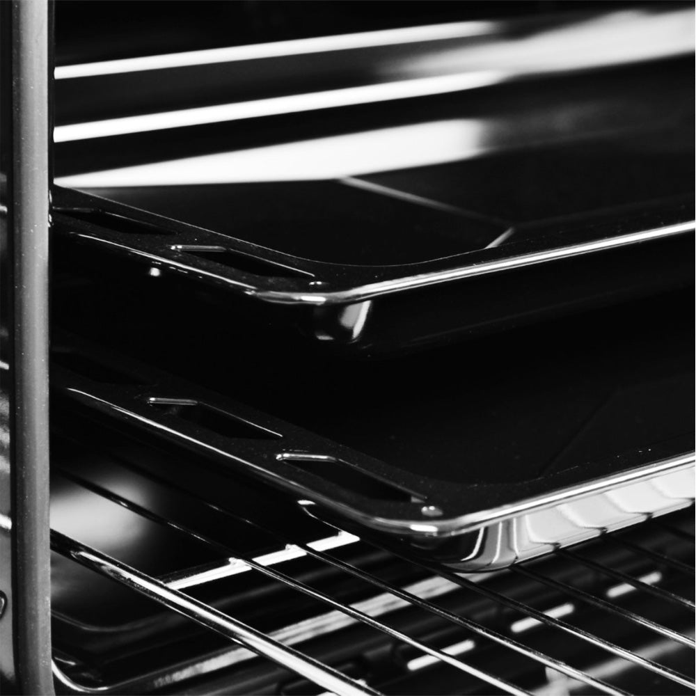 De elektrische oven heeft een netto inhoud van 53 liter, ruim genoeg voor ovenschotels, pizza’s, taarten en braadstukken. De oven is geschikt voor zowel boven- en onderwarmte als hetelucht, zodat gerechten gelijkmatig garen. Met de instelbare temperatuur bereid je elk gerecht precies zoals gewenst.