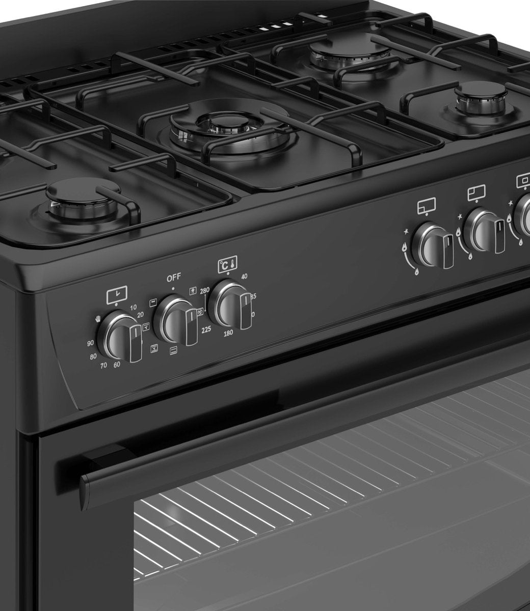 Wiggo WO‑E905R(BB) – Vrijstaand gasfornuis – 90 cm – 5 kookzones met wokbrander – 110L elektrische oven – Zwart – Elektrische vonkontsteking & vlambeveiliging – Energieklass