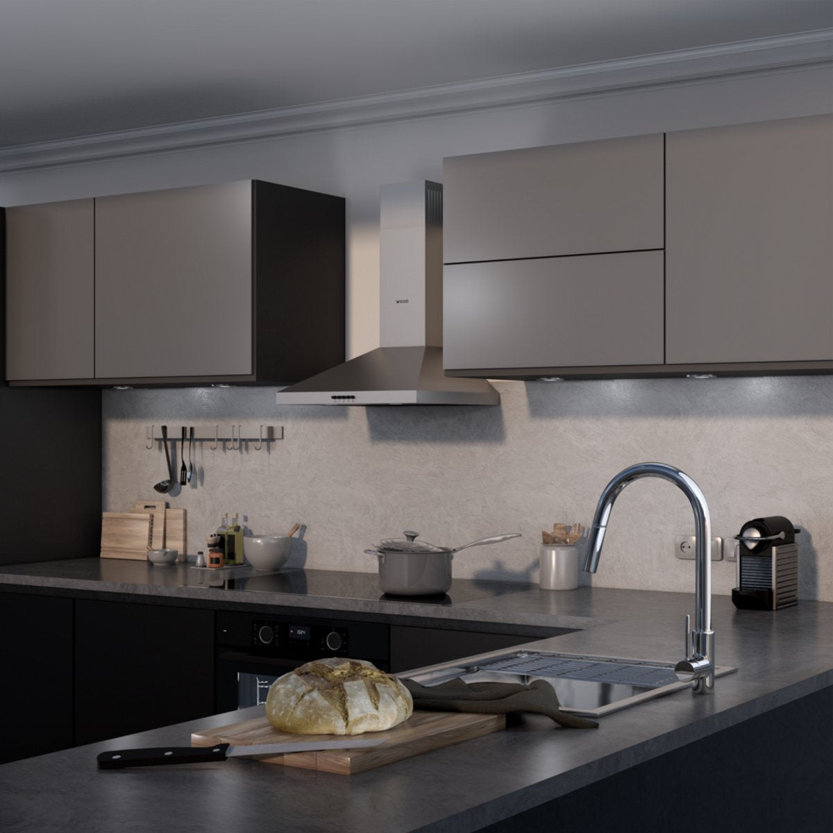 De Wiggo Pyramid Wandschouw Afzuigkap (WE-A530P) combineert een strak, modern design met krachtige prestaties. Dankzij het tijdloze piramide-ontwerp en de keuze uit meerdere kleuren past deze afzuigkap perfect in elke keukenstijl — van klassiek tot industrieel.