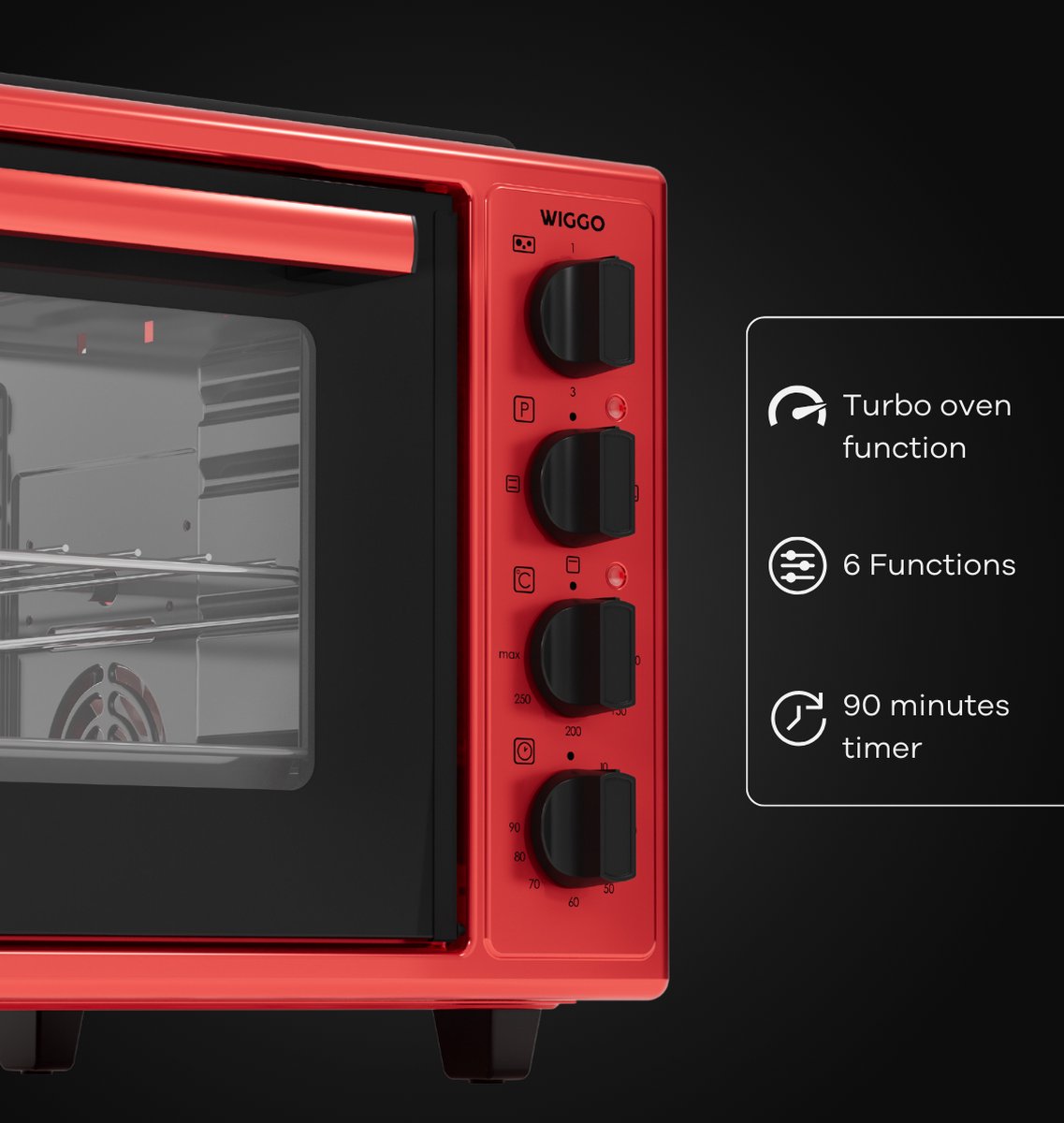 Turbo Fan:Turboventilatorfunctie zorgt ervoor dat warme lucht snel circuleert, waardoor voedsel sneller kan worden gekookt. De lucht die door de ventilator wordt verspreid, bereikt beide zijden van het voedsel, waardoor het gelijkmatig wordt gekookt.